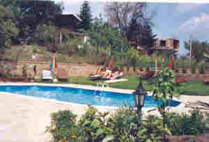 Swimmingpool, Fischteich, Brunnen und offenem Grill. Der Gemüse- und