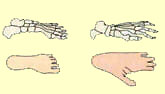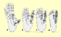 Bau und Umriss des Fußes von a) Orang-Utan, b) Schimpansen, c) Berggorilla